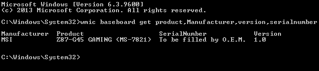 wmic baseboard get product,Manufacturer,version,serialnumber